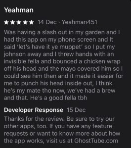 There is also a pop-up with a link to the GhostTube YouTube channel [which is actually called Amy’s Crypt] which I didn’t realise was a thing until trying out the app, so at least it’s generating extra awareness of the channel.